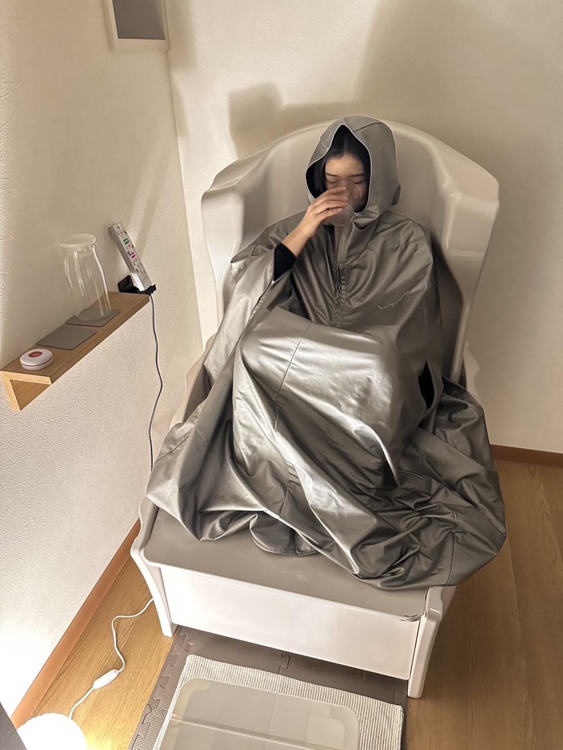 カウンセリング後に専用のウェアに着替えます。遠赤外線を含んだ特殊な素材なのでよもぎ蒸しの効果をより高めます。汗拭き用のタオル・水分もご用意してます。
