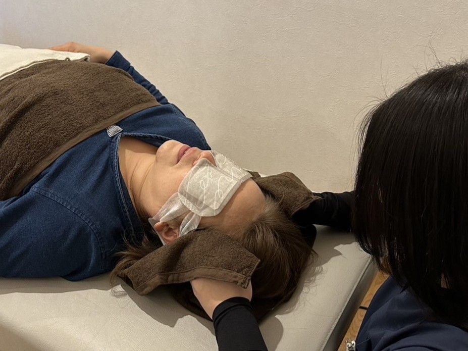 目を温めながら首と頭をしっかりほぐしていきます。目の疲れ、頭痛、寝つきが悪い等でお悩みの方にオススメ!目のパッチリ感、頭のスッキリ感を体感できます!